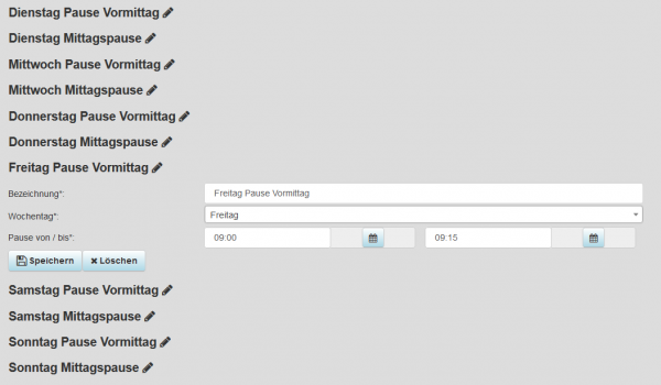 Eingabemaske Betriebspausen. Für einzelne Mitarbeiter können auch abweichende Betriebspausen festgelegt werden.