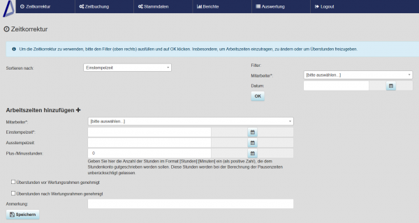 - einer webbasierten Benutzeroberfläche (das "Back-end"). Dort können die MitarbeiterInnen der Buchhaltung die Mitarbeiter-Stammdaten einpflegen, Arbeitszeitkorrekturen durchführen sowie Fehl- und Krankheitstage eintragen. Zudem kann der Mitarbeiter-Monatsbericht für jeden Mitarbeiter eingesehen werden. Aus dem Mitarbeiter-Monatsbericht können direkt Fehltage nachgetragen werden, Überstunden genehmigt werden und Arbeitszeiten korrigiert werden.